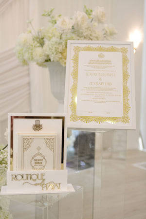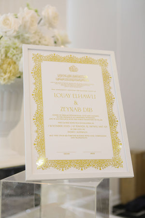 The Nikkah Contract is printed for you so you dont have to! The Nikkah contract is printed with 99% perfect foil and in A3 size with 300GSM Velvet Card Paper, imagine a soft velvet touch business card but in A3 size! 😍