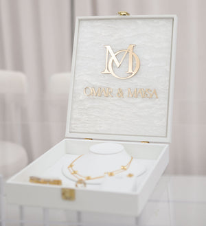 Stunning White Display Box with Gold accents and Pearl back board with Gold Acrylic writing